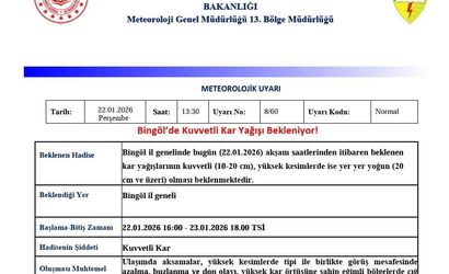 Meteoroloji 13. Bölge Müdürlüğü açıklamasında, Bingöl il genelinde 22.01.2026 akşam saatlerinden itibaren başlayacak kar yağışlarının kuvvetli (10-20 cm) olacağı; yüksek kesimlerde yer yer yoğun (20 cm ve üzeri) kar beklenildiği belirtildi. Yağışın 23.01.2026 saat 18.00'e kadar süreceği ifade edildi.