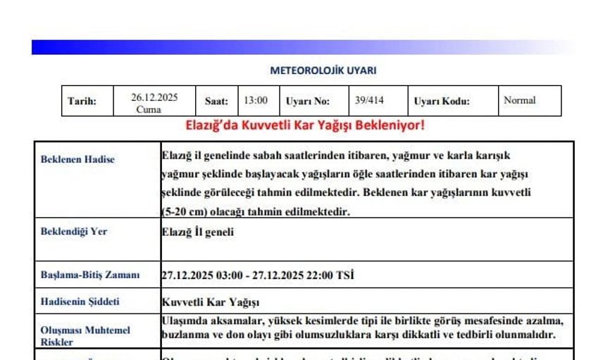 Meteoroloji 13. Bölge Müdürlüğü, Elazığ, Bingöl ve Tunceli için uyarı yayımladı. Kurumun açıklamasına göre bölge genelinde yağışlar sabah saatlerinde yağmur ve karla karışık yağmur şeklinde başlayacak, öğle saatlerinden itibaren ise kar yağışına dönüşecek.