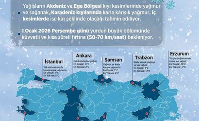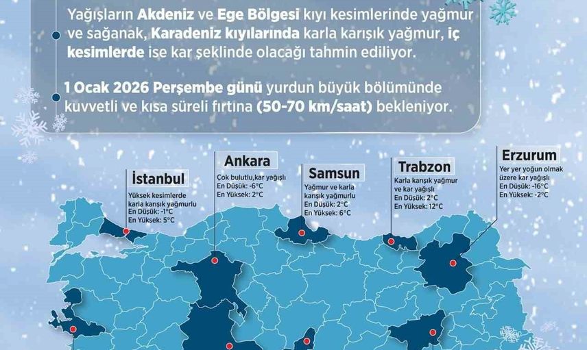 Meteoroloji Genel Müdürlüğü, 31 Aralık 2025 ile 1 Ocak 2026 tarihleri arasına ilişkin hava tahminlerini paylaştı. Yeni yılın ilk gününde ülke genelinde soğuk ve yağışlı havanın etkili olacağı bildirildi.