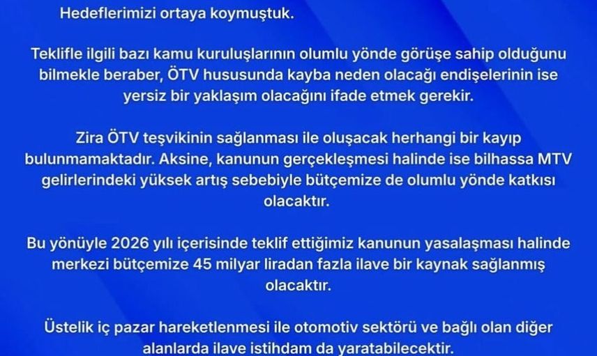 Özdemir, bazı kamu kuruluşlarının teklif hakkında olumlu görüş bildirdiğini, ancak ÖTV nedeniyle kayıp olacağı yönündeki endişelerin yersiz olduğunu belirtti. Buna göre teşvik uygulaması herhangi bir kayba yol açmayacak; aksine, özellikle MTV gelirlerindeki artış sayesinde bütçeye olumlu yansıyacak.