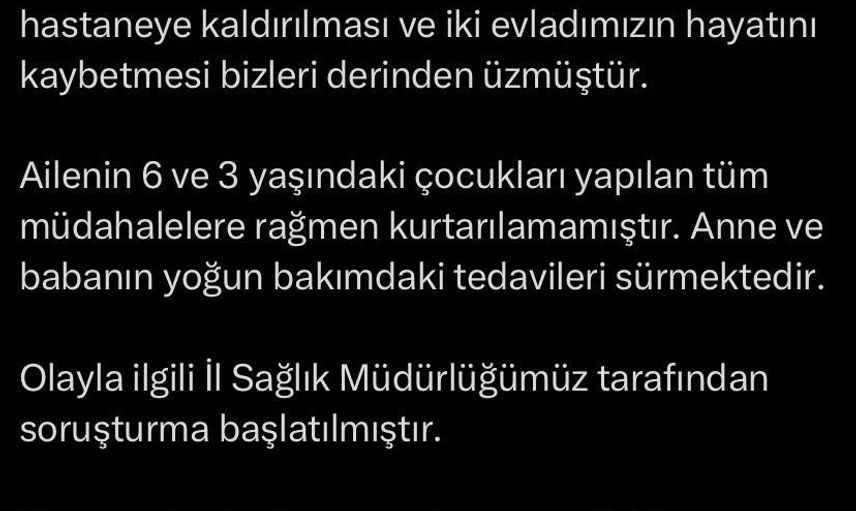 "Ailenin 3 ve 6 yaşlarındaki çocukları yapılan tüm müdahalelere rağmen kurtarılamamıştır. Anne ve babanın yoğun bakımdaki tedavileri sürmektedir", diye belirten Güner, hayatını kaybeden çocuklara rahmet, aileye sabır dilediğini ve anne-babanın tedavileri için tüm imkanların seferber edildiğini duyurdu.