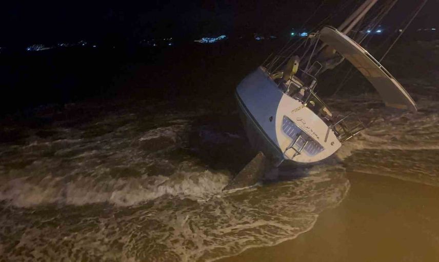 Muğla’nın Milas ilçesinde etkili olan şiddetli fırtına, kıyıda bağlı bulunan milyonluk yelkenli tekneyi yan yatırıp sürükleyerek karaya vurmasına neden oldu.