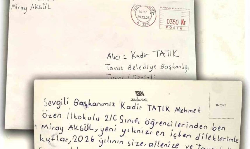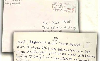 Miray'ın mektubundan: 'Sevgi Başkanımız Kadir Tatık; Mehmet Özen İlkokulu 2/C sınıfı öğrencilerinden ben Miray Akgül. Yeni yılınızı en içten dileklerimle kutlar, 2026 yılının size, ailenize ve Tavas halkına şans, sağlık ve mutluluk getirmesini temenni ederim. Sınıfımıza en kısa zamanda sizleri bekleriz'