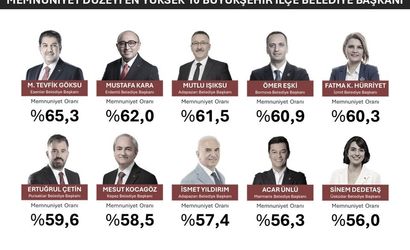 MLS Araştırması sonuçlarına göre Türkiye genelinde memnuniyet düzeyi en yüksek büyükşehir ilçe belediye başkanları şu şekilde sıralandı: %65,3 ile Tevfik Göksu (Esenler), %62 ile Mustafa Kara (Erdemli), %61,5 ile Mutlu Işıksu (Adapazarı), %60,9 ile Ömer Ekşi (Bornova), %60,3 ile Fatma Kaplan Hürriyet (İzmit), %59,6 ile Ertuğrul Çetin (Pursaklar), %58,5 ile Mesut Kocagöz (Kepez), %57,4 ile İsmet Yıldırım (Ümraniye), %56,3 ile Acar Ünlü (Marmaris) ve %56 ile Sinem Dedetaş (Üsküdar).