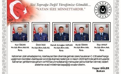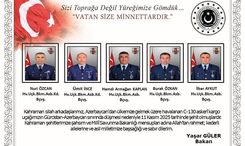 MİLLİ SAVUNMA BAKANLIĞI (MSB) ASKERİ KARGO UÇAĞININ GÜRCİSTAN-AZERBAYCAN SINIRINDA DÜŞMESİ NEDENİYLE 20 ASKERİN ŞEHİT OLDUĞUNU AÇIKLADI.
