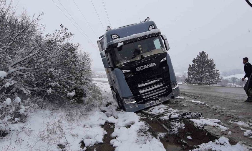 Bolu’nun Mudurnu ilçesi ile Ankara’nın Nallıhan ilçesini birbirine bağlayan karayolunda etkili olan kar yağışı sırasında, rampaya gelen tır zeminin kaygan olması nedeniyle kontrolden çıktı. Savrulan araç yol kenarındaki şarampole kayarak yan yattı.