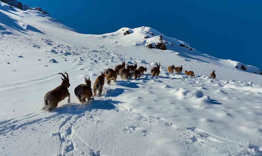 Doğa Koruma Birliği (IUCN) tarafından yayımlanan Nesli Tükenme Tehlikesi Altında Olan Türlerin Kırmızı Listesi'nde yer alan yaban keçileri, karlı dağ sıralarını aşarken adeta belgesel sahnelerini aratmayacak kareler oluşturdu.