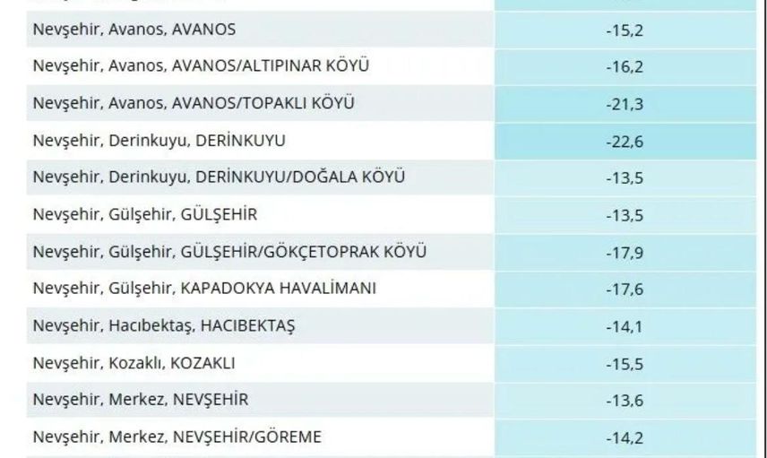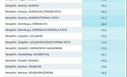 Yapılan ölçümlerde Derinkuyu'da hava sıcaklığı -22,6 derece olarak kayıtlara geçti. Bunu Avanos'a bağlı Topaklı köyü -21,3 derece ve Acıgöl ilçesi -19,6 derece ile izledi.