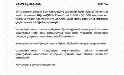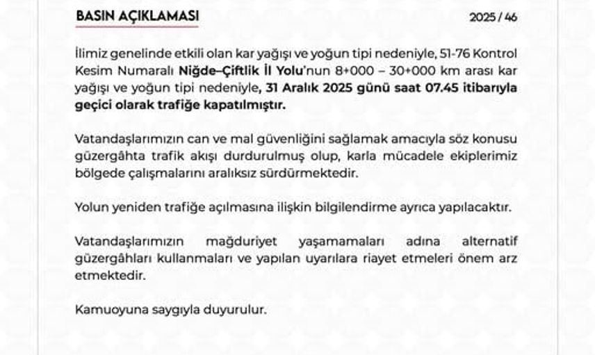 Niğde Valiliği tarafından yapılan açıklamada, yoğun kar yağışı ve tipi nedeniyle 51-76 Kontrol Kesim Numaralı Niğde-Çiftlik İl Yolu üzerinde, 8. kilometre ile 30. kilometre arasındaki bölümün, 31 Aralık 2025 günü saat 07.45 itibarıyla araç trafiğine kapatıldığı bildirildi.