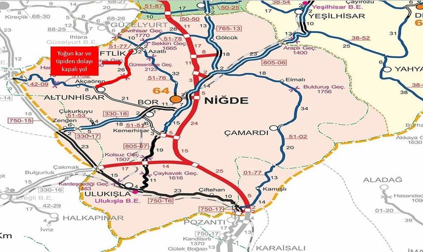Açıklamaya göre, Niğde-Çiftlik yolunun 8 ile 30'uncu kilometreleri arasındaki bölüm ile Çiftlik-Altunhisar yolunun 32 ile 56'ncı kilometreleri arasının, vatandaşların can ve mal güvenliğinin sağlanması amacıyla 12 Ocak 2026 saat 23.30 itibarıyla geçici olarak trafiğe kapatıldığı bildirildi.