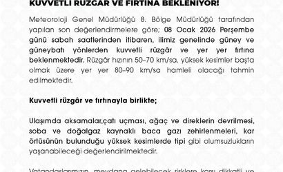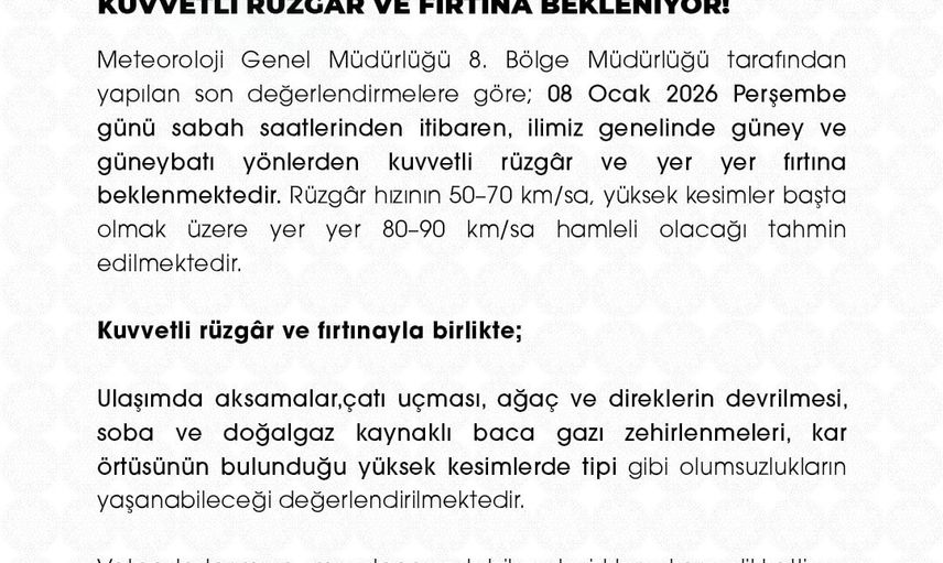 Yapılan açıklamada rüzgar hızının 50-70 km/saat seviyelerinde olmasının, yüksek kesimlerde ise yer yer 80-90 km/saat hızla esebilecek kuvvetli hamlelerin görülebileceğinin tahmin edildiği belirtildi.