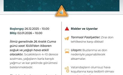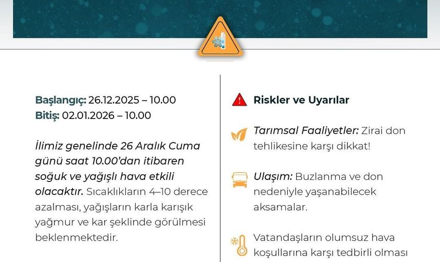 Açıklamaya göre; 26 Aralık 2025 Cuma günü saat 10.00'dan itibaren Balkanlar üzerinden gelecek soğuk ve yağışlı havanın Niğde'de etkili olması bekleniyor. Uyarının 2 Ocak 2026 Perşembe günü saat 10.00'a kadar devam edeceği bildirildi.