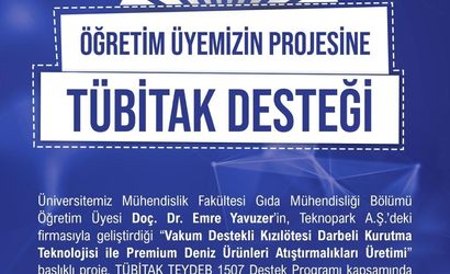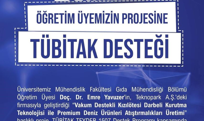 Niğde Ömer Halisdemir Üniversitesi Mühendislik Fakültesi Gıda Mühendisliği Bölümü Öğretim Üyesi Doç. Dr. Emre Yavuzer ile Teknopark A.Ş. bünyesindeki firması tarafından geliştirilen "Vakum Destekli Kızılötesi Darbeli Kurutma Teknolojisi ile Premium Deniz Ürünleri Atıştırmalıkları Üretimi" başlıklı proje, TEYDEB 1507 Destek Programı kapsamında desteklenmeye hak kazandı.