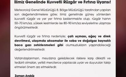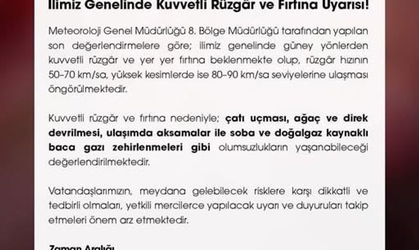 Valilik uyarısında, kuvvetli rüzgar ve fırtınanın çatı uçması, ağaç ve direklerin devrilmesi, ulaşımda aksama ile soba ve doğalgaz kaynaklı baca gazı zehirlenmeleri gibi olumsuzluklara neden olabileceği vurgulanarak vatandaşların can ve mal güvenliği açısından dikkatli ve tedbirli olmaları istendi.