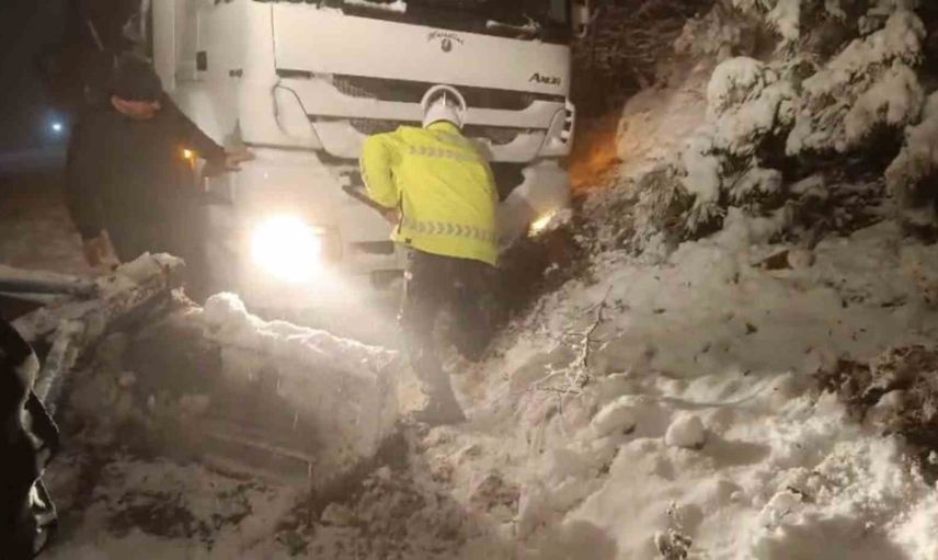 Yoğun kar yağışı ve buzlanmanın etkili olduğu noktada polis ekipleri, Karayolları ekipleri ve çevredeki vatandaşların desteğiyle aracın çevresindeki karı küreklerle temizleyerek yolu açma çalışması yürüttü. Yapılan müdahale ve kurtarma çalışmaları yaklaşık 1 saat sürdü.