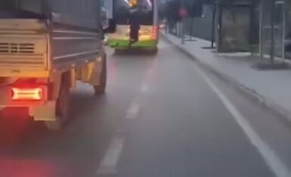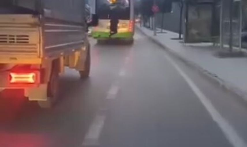 Ardından kayda yansıyan diğer anlarda ise bir genç, seyir halindeki halk otobüsünün arka tamponuna tutunarak gizli bir yolculuk yaptı. Her iki davranış da trafikte bulunan diğer sürücüler için ciddi tehlike oluşturdu.