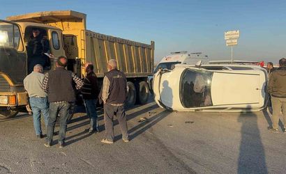 Nizip'te hafriyat kamyonu ile çarpışan otomobil yan yattı