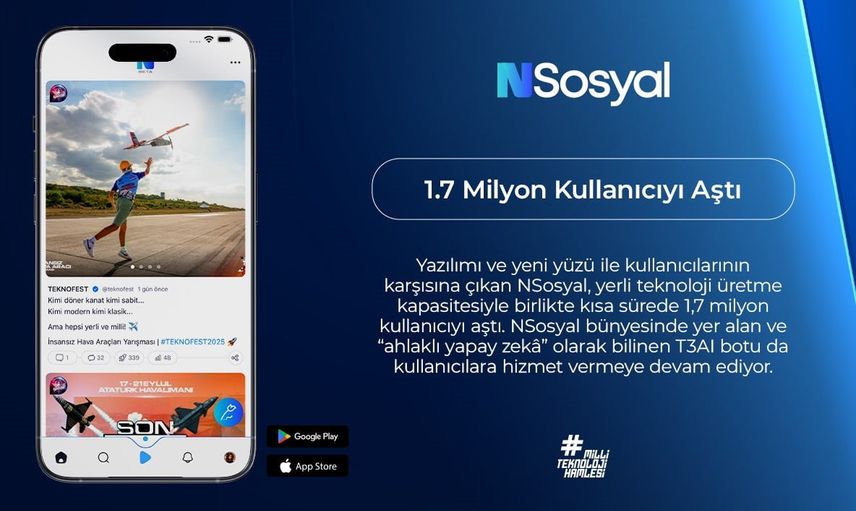 Yenilenen yazılım ve arayüzle kullanıcılarının karşısına çıkan NSosyal, yerli teknoloji üretme kapasitesiyle kısa sürede 1,7 milyon kullanıcıyı aştı. Platform bünyesindeki ve 'ahlaklı yapay zekâ' olarak tanımlanan T3AI botu da kullanıcılara hizmet vermeye devam ediyor.