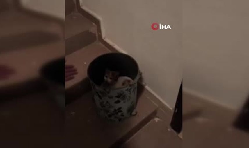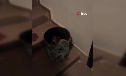 Karataş Mahallesi'ndeki olayda, dışarıdaki sert hava şartları hem insanlar hem de sokak hayvanları üzerinde olumsuz etki yaratırken, caddeye çıkan kedi apartmanın 2'nci katına kadar tırmanıp, iç bölmesinde barınmak üzere çöp kutusuna girdi.
