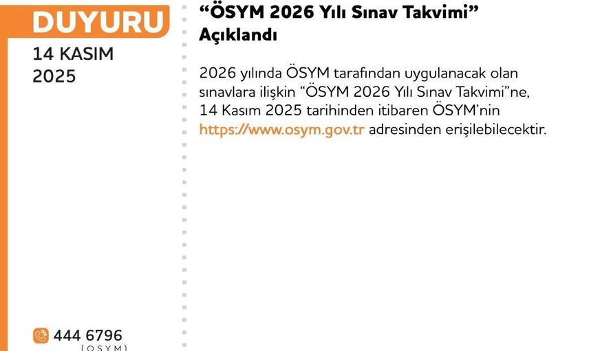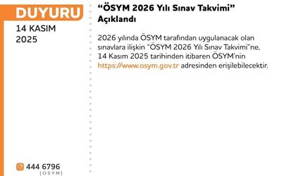 Ölçme, Seçme ve Yerleştirme Merkezi (ÖSYM), 2026 yılına ilişkin sınav takvimini yayımladı. Kurumun duyurusunda yer alan başlıca sınav tarihleri aşağıdaki gibidir.