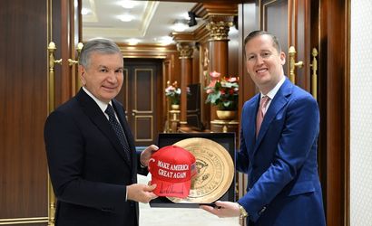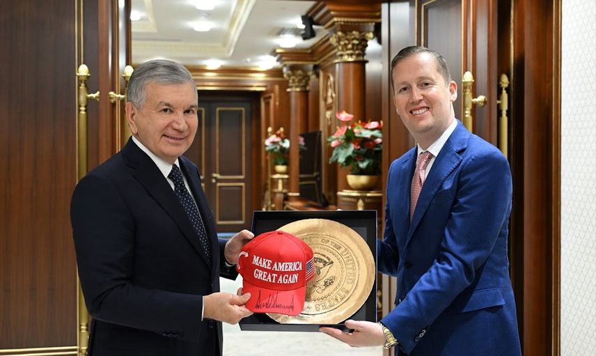 Görüşmenin sonunda Gor, Mirziyoyev’e ABD bayrağı ve Trump’ın imzasını taşıyan kırmızı bir şapka hediye etti.