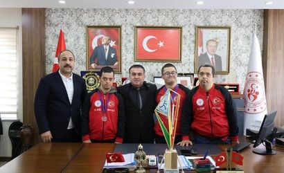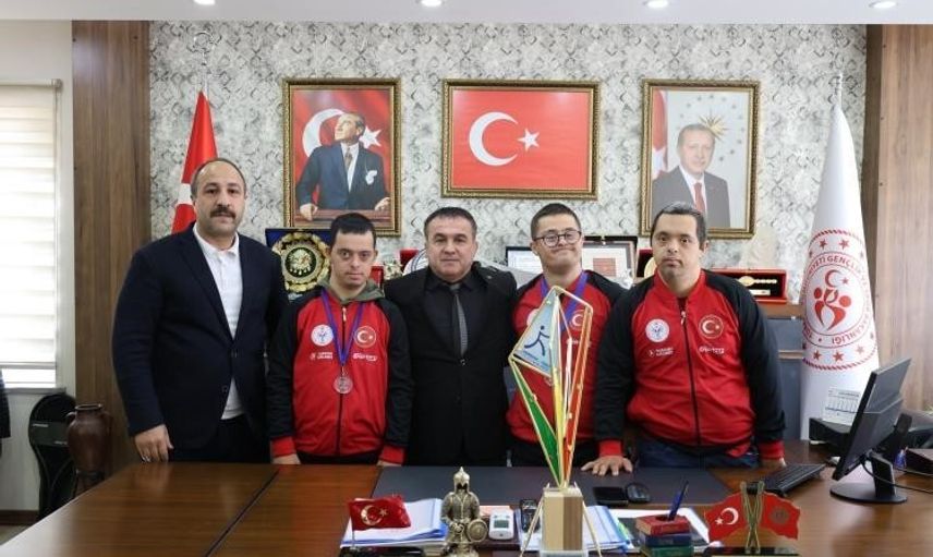 SU-DS Avrupa Şampiyonası’nda elde ettikleri başarıyı Bilecik’te kutlayan Özel Sporcular Down Sendromlu Basketbol Milli Takımı, Bilecik Gençlik ve Spor İl Müdürü Ramazan Demir'i makamında ziyaret etti.
