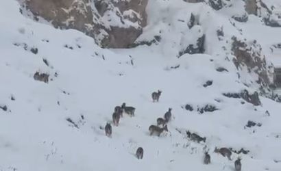 Palu Kalesi'nde kar örtüsünde sürü halinde otlayan dağ keçileri