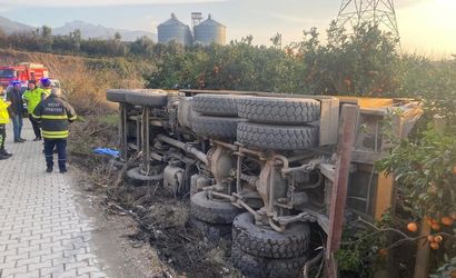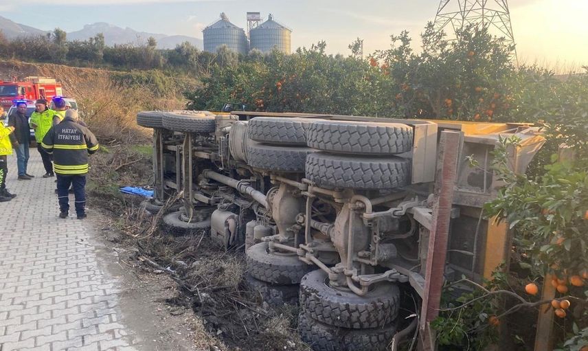 Hatay'ın Payas ilçesi Cumhuriyet Mahallesinde sürücünün direksiyon hakimiyetini kaybetmesi sonucu bir hafriyat kamyonu narenciye bahçesine devrildi.