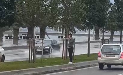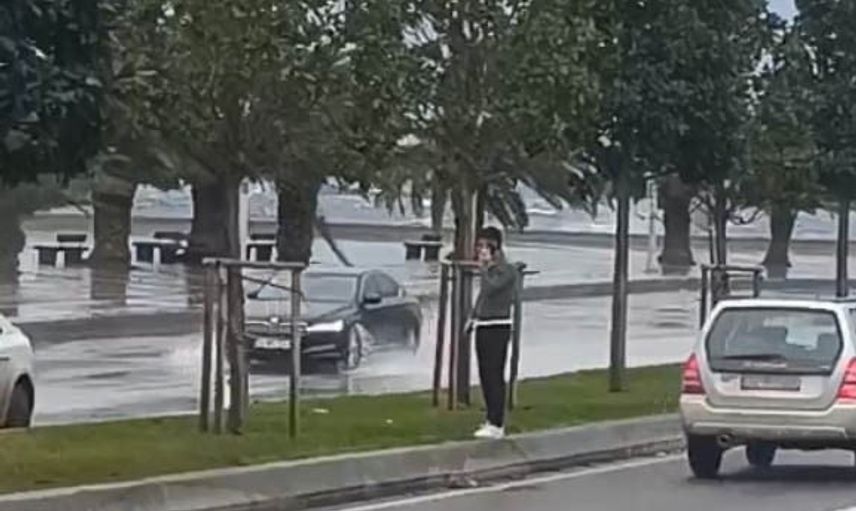 Kaydedilen görüntülerde, araçların yola taşan deniz suyunun içinden geçtiği ve ağaçların şiddetle savrulduğu anlar dikkat çekti.