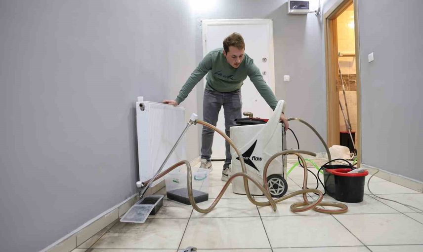 Yılmaz, kış öncesinde yoğunluk yaşadıklarını, uygulamanın yaklaşık 30-40 dakika sürdüğünü ve peteklerin sökülmeden tamamen temizlendiğini anlattı. İşlem sırasında banyodaki peteğe basınçlı makine bağlanarak tüm peteklere su veriliyor ve kombinin filtreleri temizleniyor.