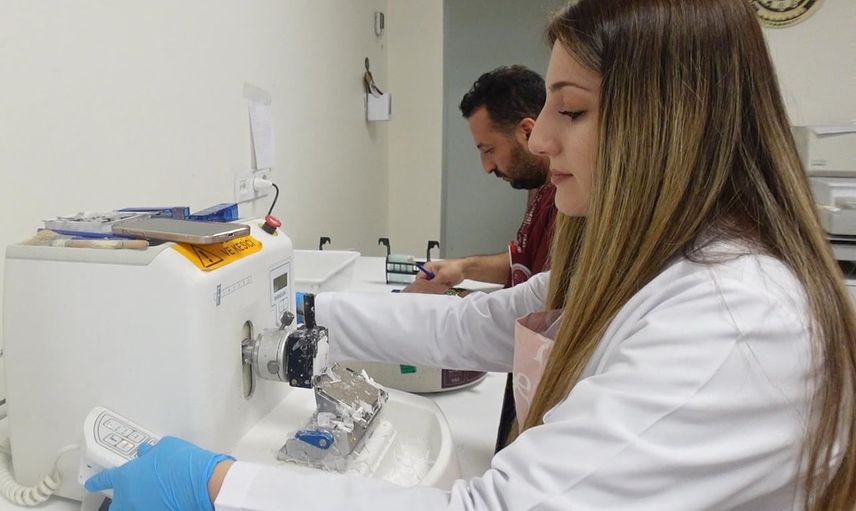 Patoloji laboratuvarında doku örneklerinin kabulünden raporlanmasına kadar uzanan sürecin titizlikle yürütüldüğünü anlatan Özercan, uygulanan yöntemi şöyle özetledi: Doku örnekleri önce kayıt altına alınıyor, ardından formalin ile tespit edilip çeşitli sıvılardan geçirilerek parafine gömülüyor. Hazırlanan bloklardan 4 mikron kalınlığında kesitler alınıp camlara yerleştiriliyor, boyama işlemlerinin ardından mikroskop altında inceleniyor.