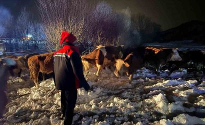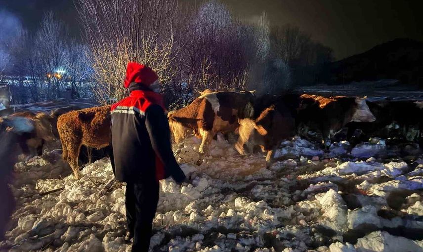 Kazanın yaşandığı alanda yürütülen çalışmalarda, tırda bulunan 45 büyükbaş hayvan çevredeki uygun ahırlara nakledilerek donma riskinden kurtarıldı.