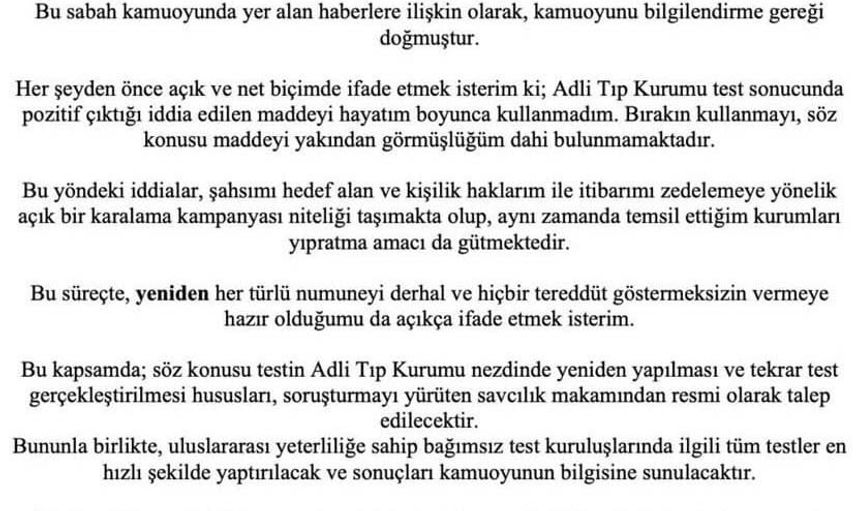 Ayrıca, hakkında gizlilik kararı bulunan bir dosyaya ait olduğu belirtilen bilgilerin, test sonucunun çıktığı iddia edilen sabahın ilk saatlerinden itibaren eş zamanlı ve koordineli şekilde bazı mecralarda yayımlandığına dikkat çekti ve bu durumu ayrıca değerlendireceklerini kaydetti.