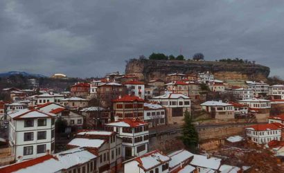 Karabük'ün UNESCO Dünya Mirası Listesinde yer alan Safranbolu ilçesindeki tarihi evler, kış mevsiminde yağan karla birlikte havadan görüntülendi.