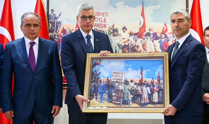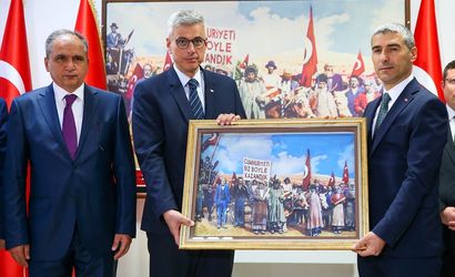 Sağlık Bakanı Kemal Memişoğlu (sağda), Uşak Valisi Naci Aktaş'ı (sol 2) ziyaret etti. Bakan Memişoğlu'nu, Aktaş, valilik girişinde karşıladı.