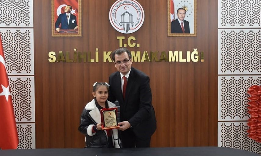 Manisa'nın Salihli ilçesinde 29 Ekim-4 Kasım Kızılay Haftası etkinlikleri kapsamında gerçekleştirilen "Salihli Sana Kanım Feda" kan bağışı kampanyasında dereceye giren öğrenciler, Salihli Kaymakamı Ali Güldoğan'ı makamında ziyaret etti.