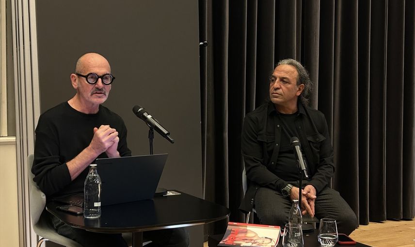 Performans sanatının Türkiye'deki başarılı temsilcilerinden biri olarak gösterilen ve "Moni" mahlasıyla tanınan Salim Özgilik (sağda), küratör, yazar ve eğitmen Vasıf Kortun'un moderatörlüğünde (solda) Salt Galata'da bir söyleşi gerçekleştirdi.