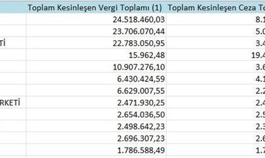 A listesi, ikmalen, re’sen veya idarece yapılan tarhiyatlar sonucu kesinleşen ve toplam tutarı 5 milyon TL ve üzerinde olan vergi ve cezaları kapsıyor. Bu kategoride Samsun’dan 12 şirket yer aldı ve bu şirketlerin toplam borcu 207 milyon 962 bin 915 TL olarak kaydedildi.