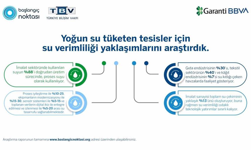 Garanti BBVA ve Türkiye Bilişim Vakfı’nın Başlangıç Noktası platformu iş birliğiyle gerçekleştirilen 'Sanayide Su Verimliliği' raporu, gıda, tekstil ve kâğıt sektörlerindeki su kullanımı, verimlilik potansiyeli ve sürdürülebilir finansman modellerini inceliyor. Çalışma, Türkiye'nin 25 havzasındaki su potansiyelini ve sektörlerin bölgesel dağılımını değerlendirdi.
