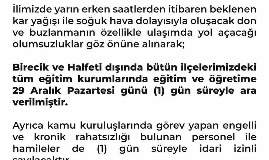 Şanlıurfa Valiliği, yarın beklenen kar yağışı ve muhtemel buzlanma nedeniyle Halfeti ve Birecik ilçeleri hariç il genelindeki eğitim kurumlarında 29 Aralık Pazartesi günü 1 gün süreyle eğitime ara verildiğini açıkladı.