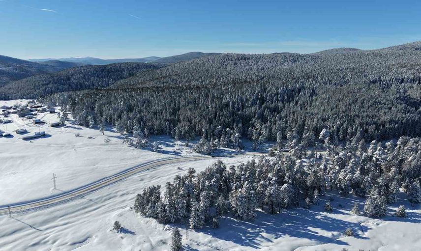 Yaylanın kış manzarası, bölgeden havadan çekilen dron görüntüleriyle kayıt altına alındı. Beyaza bürünen yayla evleri ve ağaçların oluşturduğu düzenli görünüm, doğal güzelliği ve sakinliği vurguluyor.