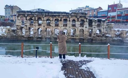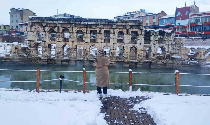 Yaklaşık 50 derece sıcaklıktaki termal sudan yükselen yoğun buhar, karla kaplı ortama farklı bir boyut kazandırdı. UNESCO Dünya Mirası Geçici Listesi'nde yer alan bu tarihi yapı, kış mevsiminde de fotoğraf tutkunları ve ziyaretçiler tarafından ilgi görüyor.