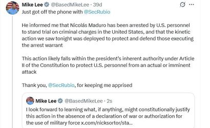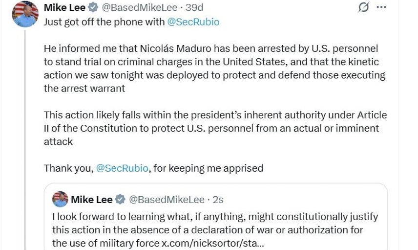Daha önce yaptığı paylaşımda Lee, operasyonun anayasal dayanağını sorgulamıştı ve şu ifadeyi kullanmıştı: "Savaş ilanı veya askeri güç kullanma yetkisi olmaksızın bu eylemi anayasal olarak haklı çıkarabilecek herhangi bir gerekçe olup olmadığını öğrenmeyi dört gözle bekliyorum."