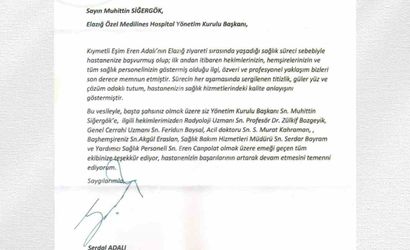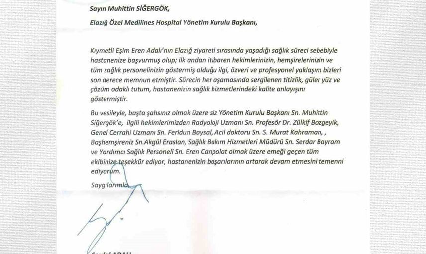Serdal Adalı, Beşiktaş Spor Kulübü ve Türkiye Jokey Kulübü Yönetim Kurulu Başkanı, eşinin Elazığ programı kapsamında tedavi gördüğü Elazığ Medilines Hospital'e ilettiği teşekkür mesajı ile dikkat çekti.