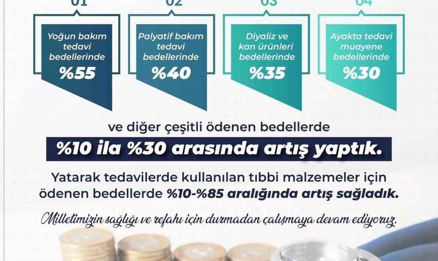 SGK paylaşımında şu ifadelere yer verildi: "Tedavilere ilişkin karşılanan bedellerde yüzde 10 ila yüzde 55 oranında artış sağladık. Yatarak tedavilerde kullanılan tıbbi malzemelerin bedellerinde yüzde 10 ila yüzde 85 oranında artış gerçekleştirdik. Bu düzenlemelerle, bedeli karşılanan sağlık hizmetlerinde toplam 110 milyar lira tutarında iyileştirme sağladık. Herkes için daha erişilebilir sağlık hizmeti sunmak için durmaksızın çalışıyoruz."