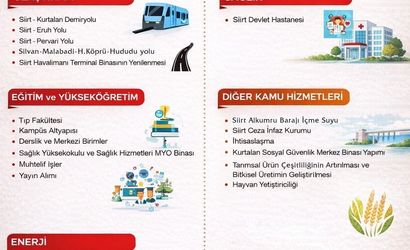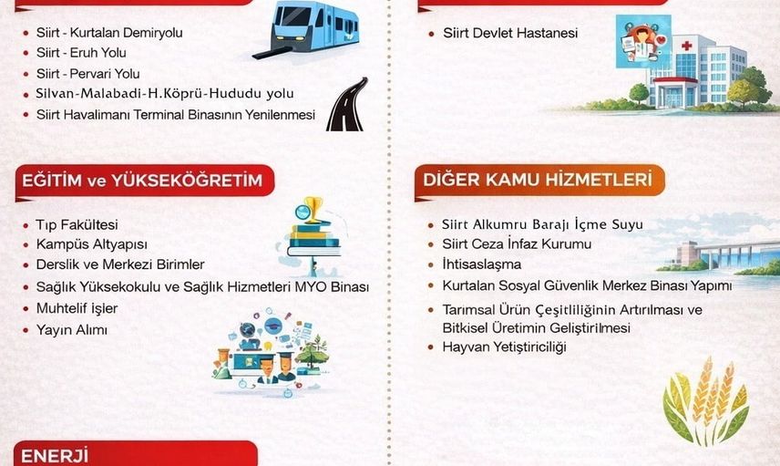 Program kapsamında yer alan başlıca yatırımlar arasında Siirt Alkumru Barajı İçme Suyu Projesi, Siirt Ceza İnfaz Kurumu ve Kurtalan Sosyal Güvenlik hizmet binası bulunuyor. Ayrıca tarımsal ürün çeşitliliğinin artırılması, bitkisel ve hayvansal üretimin desteklenmesi ile eğitim ve ihtisaslaşma alanlarında çok sayıda proje planlanmıştır.