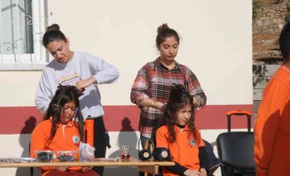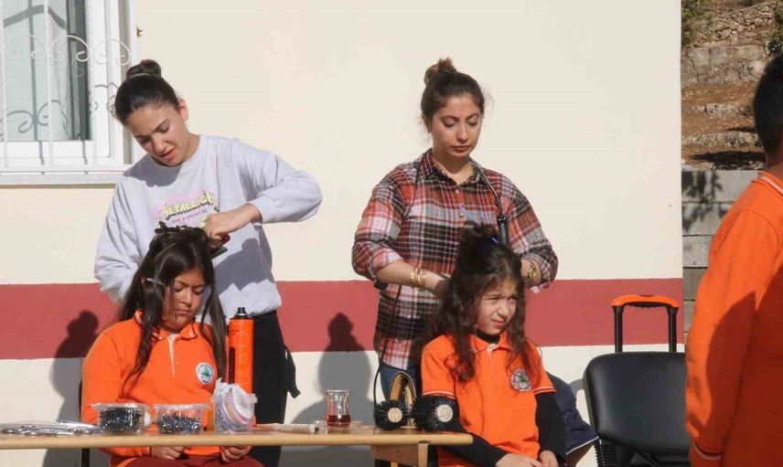 Kursiyerler, öğrencilerin saç bakımlarını yaparken aynı zamanda kişisel gereksinimlerini de karşıladı; bu sayede çocuklara hem destek sunuldu hem de moral verildi.