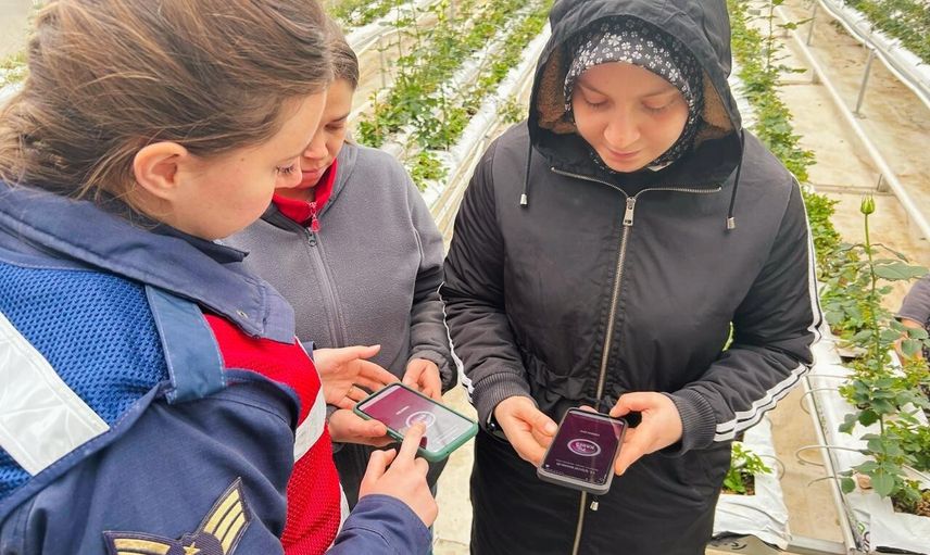 Kütahya İl Jandarma Komutanlığı Aile İçi Şiddetle Mücadele Çocuk Kısım Amirliği ve Simav İlçe Jandarma Komutanlığı ekipleri, Simav ilçesi Çitgöl Beldesi'ndeki çiçek serasında çalışan 54 kadına Kadın Acil Destek Uygulaması (KADES) hakkında bilgilendirme yaptı.