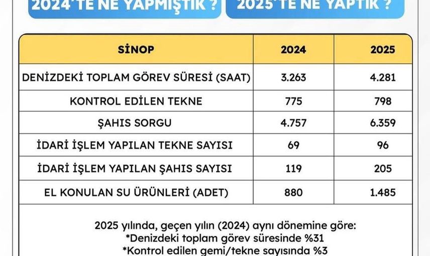 Sinop Valiliği, Sahil Güvenlik Karakol Komutanlığı tarafından 2024-2025 dönemine ait deniz güvenliği ve denetim faaliyetlerine ilişkin veriler kamuoyuna sunuldu. Açıklanan istatistikler, 2025 yılında sahada yürütülen çalışmaların ve kontrollerin arttığını gösteriyor.
