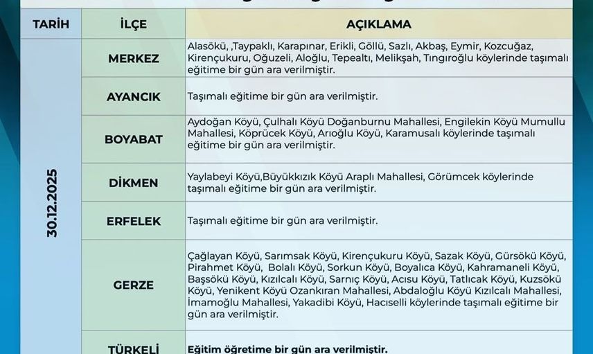 Valilikten yapılan açıklamaya göre, Türkeli ilçesinde tüm eğitim-öğretime bir gün süreyle ara verildi. Ayancık ve Erfelek ilçelerinde ise yalnızca taşımalı eğitim kapsamındaki öğrenciler için eğitim-öğretim durduruldu. Merkez ilçe ile Boyabat, Dikmen ve Gerze ilçelerinin bazı bölgelerinde kısmi olarak taşımalı eğitime bir gün ara uygulandı.